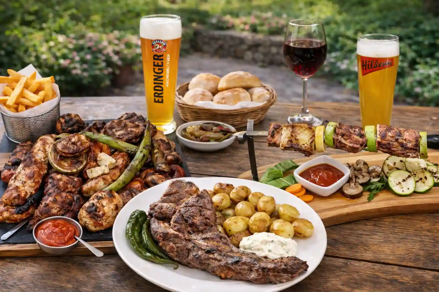 Lammkotelett, Schweinesteak, Hähnchensteak, Bifteki dazu Pommes und Tzatziki